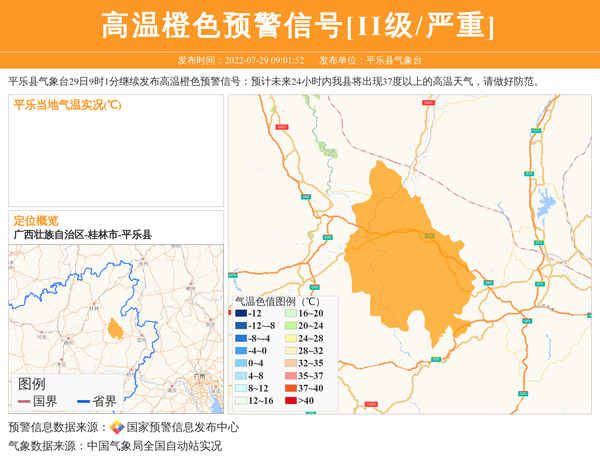 平乐县气象台29日9时1分继续发布高温橙色预警信号:预计未来24小时内我县将出现37度以上的高温天气,请做好防范。 信息来源:国家预警信息发布中心; 发布单位:平乐县气象台。