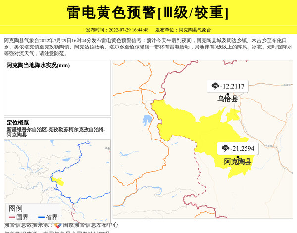 阿克陶县气象台2022年7月29日16时44分发布雷电黄色预警信号:预计今天午后到夜间,阿克陶县城及周边乡镇、木吉乡至布伦口乡、奥依塔克镇至克孜勒陶镇、阿克达拉牧场、塔尔乡至恰尔隆镇一带将有雷电活动,局地伴有8级以上的阵风、冰雹、短时强降水等强对流天气,请注意防范。 信息来源:国家预警信息发布中心; 发布单位:阿克陶县气象台。