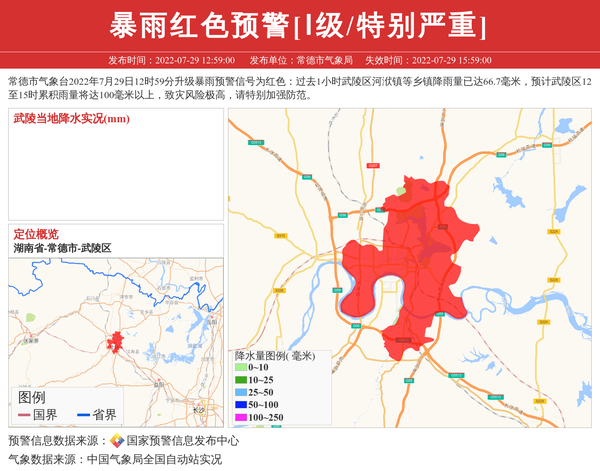 常德市气象台2022年7月29日12时59分升级暴雨预警信号为红色:过去1小时武陵区河洑镇等乡镇降雨量已达66.7毫米,预计武陵区12至15时累积雨量将达100毫米以上,致灾风险极高,请特别加强防范。 信息来源:国家预警信息发布中心; 发布单位:常德市气象局。