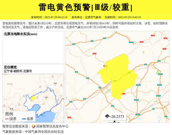 雷电黄色预警信号:预计未来1到2小时,北票市将出现雷电天气,并将持续3到4小时,同时可能伴有短时大风、冰雹、短时强降水等强对流天气,请做好防雷工作,减少户外活动。北票市气象台2022年7月29日9时39分发布 信息来源:国家预警信息发布中心; 发布单位:北票市气象局。