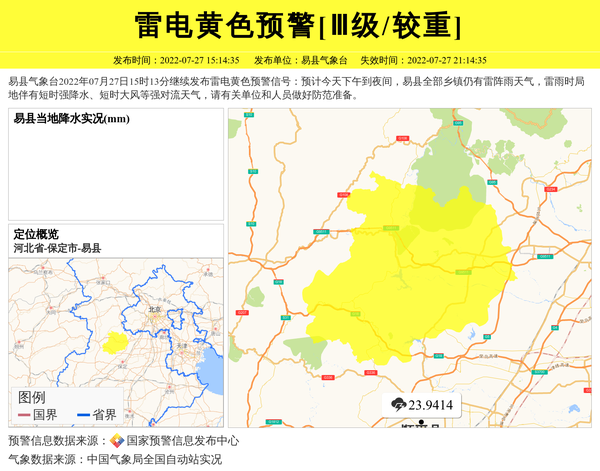 易县气象台2022年07月27日15时13分继续发布雷电黄色预警信号:预计今天下午到夜间,易县全部乡镇仍有雷阵雨天气,雷雨时局地伴有短时强降水、短时大风等强对流天气,请有关单位和人员做好防范准备。 信息来源:国家预警信息发布中心; 发布单位:易县气象台。