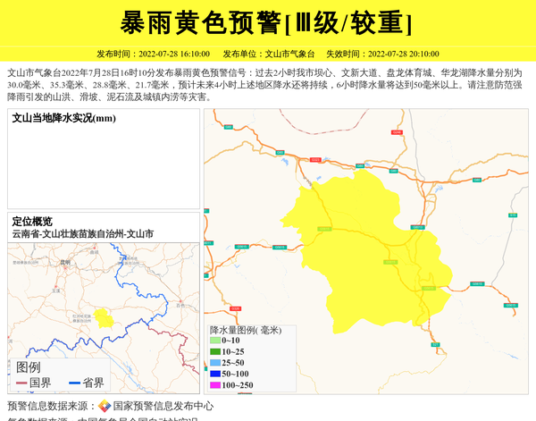 文山市气象台2022年7月28日16时10分发布暴雨黄色预警信号:过去2小时我市坝心、文新大道、盘龙体育城、华龙湖降水量分别为30.0毫米、35.3毫米、28.8毫米、21.7毫米,预计未来4小时上述地区降水还将持续,6小时降水量将达到50毫米以上。请注意防范强降雨引发的山洪、滑坡、泥石流及城镇内涝等灾害。 信息来源:国家预警信息发布中心; 发布单位:文山市气象台。