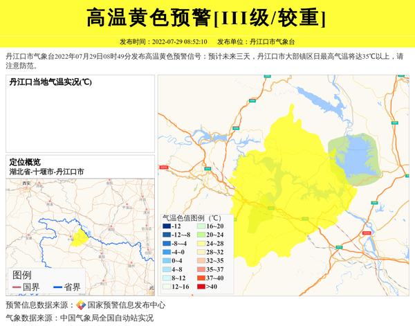 丹江口市气象台2022年07月29日08时49分发布高温黄色预警信号:预计未来三天,丹江口市大部镇区日最高气温将达35℃以上,请注意防范。 信息来源:国家预警信息发布中心; 发布单位:丹江口市气象台。
