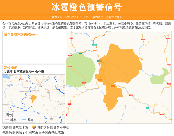 合作市气象台2022年07月29日16时48分发布冰雹橙色预警信号:预计6小时内,卡加道乡、佐盖多玛乡、佐盖曼玛镇、勒秀镇、那吾镇、卡加曼乡、当周街道、通钦街道、伊合昂街道、坚木克尔街道等部分地区有冰雹,并可能造成雹灾,请注意防范。 信息来源:国家预警信息发布中心; 发布单位:合作市气象台。