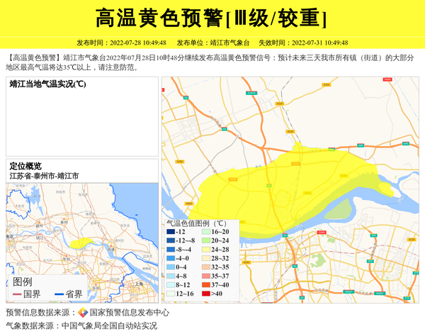 【高温黄色预警】靖江市气象台2022年07月28日10时48分继续发布高温黄色预警信号:预计未来三天我市所有镇(街道)的大部分地区最高气温将达35℃以上,请注意防范。 信息来源:国家预警信息发布中心; 发布单位:靖江市气象台。