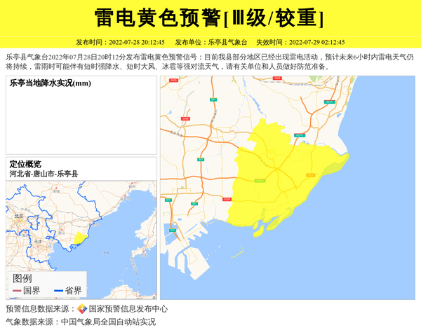 乐亭县气象台2022年07月28日20时12分发布雷电黄色预警信号:目前我县部分地区已经出现雷电活动,预计未来6小时内雷电天气仍将持续,雷雨时可能伴有短时强降水、短时大风、冰雹等强对流天气,请有关单位和人员做好防范准备。 信息来源:国家预警信息发布中心; 发布单位:乐亭县气象台。