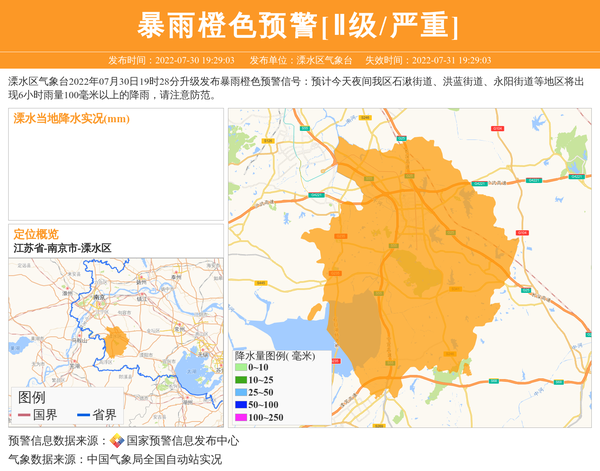 溧水区气象台2022年07月30日19时28分升级发布暴雨橙色预警信号:预计今天夜间我区石湫街道、洪蓝街道、永阳街道等地区将出现6小时雨量100毫米以上的降雨,请注意防范。 信息来源:国家预警信息发布中心; 发布单位:溧水区气象台。