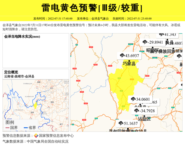会泽县气象台2022年7月31日17时48分发布雷电黄色预警信号:预计未来6小时,我县大部将发生雷电活动,可能伴有大风、冰雹或短时强降水,请注意防范。 信息来源:国家预警信息发布中心; 发布单位:会泽县气象台。