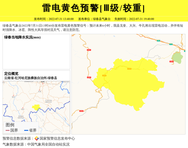 绿春县气象台发布雷电黄色预警[Ⅲ级/较重]