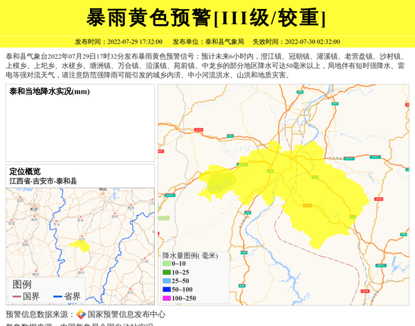 泰和县气象台2022年07月29日17时32分发布暴雨黄色预警信号:预计未来6小时内,澄江镇、冠朝镇、灌溪镇、老营盘镇、沙村镇、上模乡、上圯乡、水槎乡、塘洲镇、万合镇、沿溪镇、苑前镇、中龙乡的部分地区降水可达50毫米以上,局地伴有短时强降水、雷电等强对流天气,请注意防范强降雨可能引发的城乡内涝、中小河流洪水、山洪和地质灾害。 信息来源:国家预警信息发布中心; 发布单位:泰和县气象局。