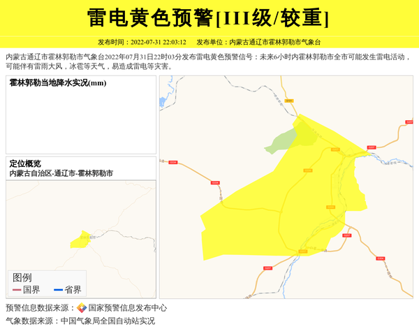 内蒙古通辽市霍林郭勒市气象台2022年07月31日22时03分发布雷电黄色预警信号:未来6小时内霍林郭勒市全市可能发生雷电活动,可能伴有雷雨大风,冰雹等天气,易造成雷电等灾害。 信息来源:国家预警信息发布中心; 发布单位:内蒙古通辽市霍林郭勒市气象台。
