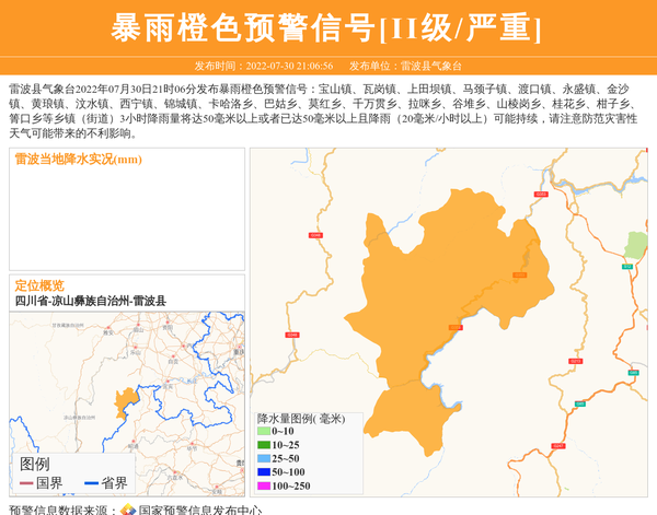 雷波县气象台2022年07月30日21时06分发布暴雨橙色预警信号:宝山镇、瓦岗镇、上田坝镇、马颈子镇、渡口镇、永盛镇、金沙镇、黄琅镇、汶水镇、西宁镇、锦城镇、卡哈洛乡、巴姑乡、莫红乡、千万贯乡、拉咪乡、谷堆乡、山棱岗乡、桂花乡、柑子乡、箐口乡等乡镇(街道)3小时降雨量将达50毫米以上或者已达50毫米以上且降雨(20毫米/小时以上)可能持续,请注意防范灾害性天气可能带来的不利影响。 信息来源:国家预警信息发布中心; 发布单位:雷波县气象台。