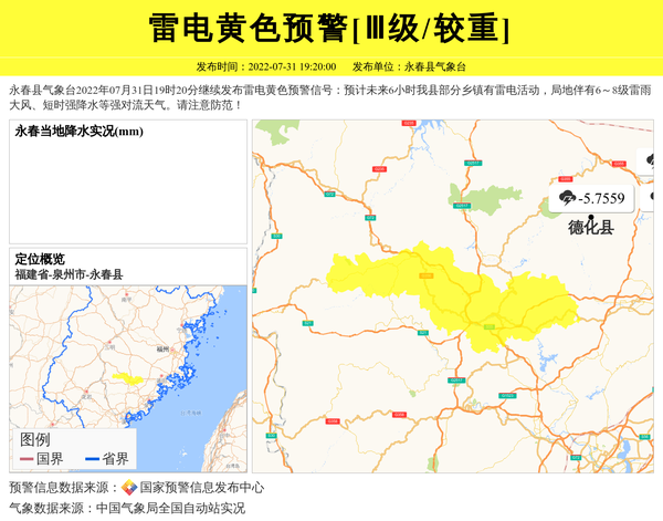 永春县气象台2022年07月31日19时20分继续发布雷电黄色预警信号:预计未来6小时我县部分乡镇有雷电活动,局地伴有6~8级雷雨大风、短时强降水等强对流天气。请注意防范! 信息来源:国家预警信息发布中心; 发布单位:永春县气象台。
