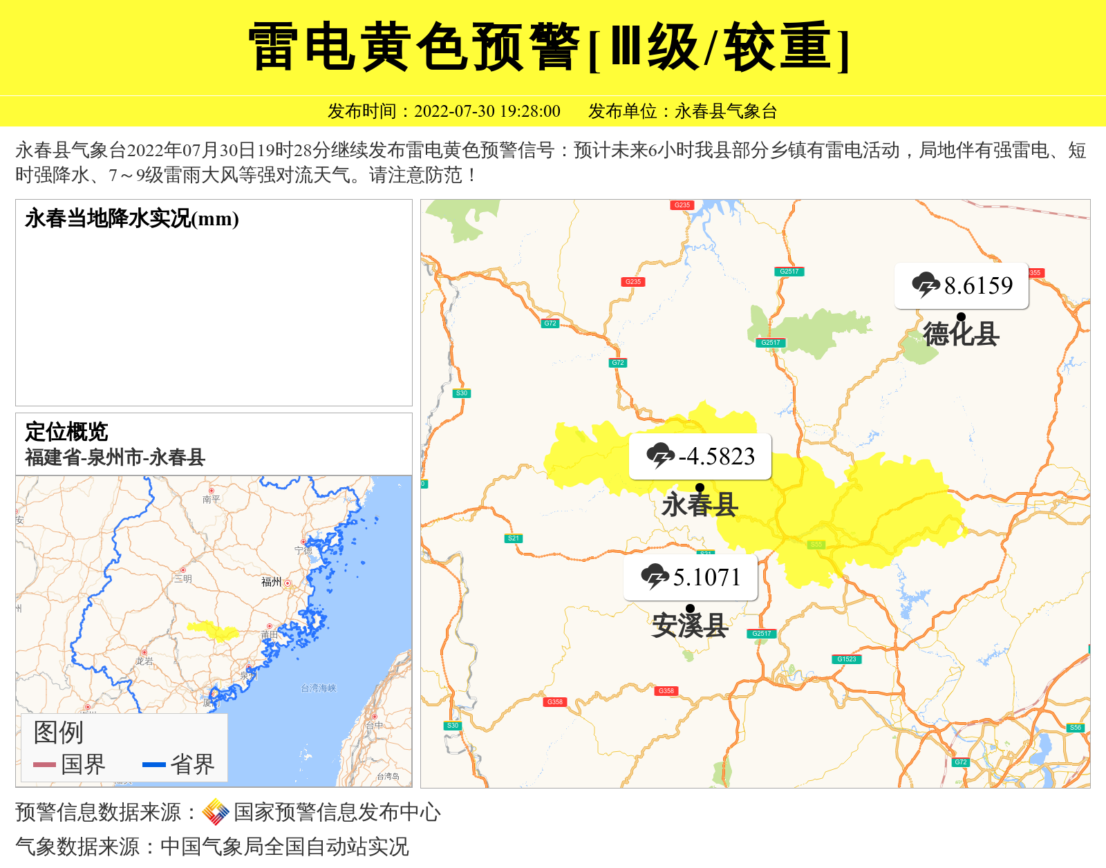 永春县气象台2022年07月30日19时28分继续发布雷电黄色预警信号:预计未来6小时我县部分乡镇有雷电活动,局地伴有强雷电、短时强降水、7~9级雷雨大风等强对流天气。请注意防范! 信息来源:国家预警信息发布中心; 发布单位:永春县气象台。