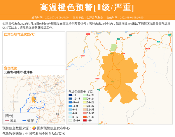 盐津县气象台2022年7月31日09时50分继续发布高温橙色预警信号:预计未来24小时内,我县海拔800米以下局部区域日最高气温将达37℃以上,请注意做好防暑降温工作。 信息来源:国家预警信息发布中心; 发布单位:盐津县气象台。