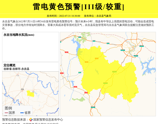 永吉县气象台2022年7月31日18时30分发布雷电黄色预警信号:预计未来6小时,我县有中等以上强度的雷电活动,可能会造成雷电灾害事故,部分地方伴有短时强降水、雷暴大风或冰雹等强对流天气,永吉县应急管理局与永吉县气象局联合提醒注意做好预防工作。 信息来源:国家预警信息发布中心; 发布单位:永吉县气象局。