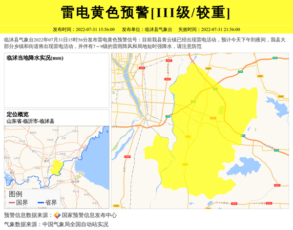 临沭县气象台2022年07月31日15时56分发布雷电黄色预警信号:目前我县青云镇已经出现雷电活动,预计今天下午到夜间,我县大部分乡镇和街道将出现雷电活动,并伴有7~9级的雷雨阵风和局地短时强降水,请注意防范 信息来源:国家预警信息发布中心; 发布单位:临沭县气象台。