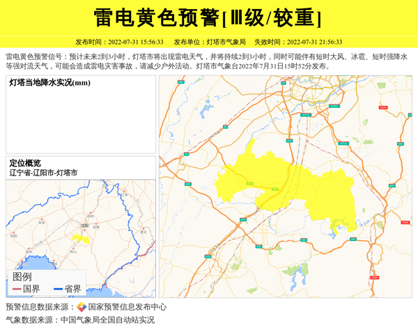 雷电黄色预警信号:预计未来2到3小时,灯塔市将出现雷电天气,并将持续2到3小时,同时可能伴有短时大风、冰雹、短时强降水等强对流天气,可能会造成雷电灾害事故,请减少户外活动。灯塔市气象台2022年7月31日15时52分发布。 信息来源:国家预警信息发布中心; 发布单位:灯塔市气象局。