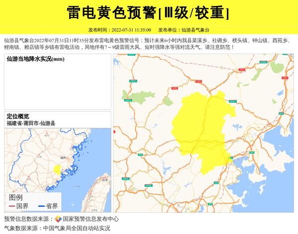 仙游县气象台2022年07月31日11时35分发布雷电黄色预警信号:预计未来6小时内我县菜溪乡、社硎乡、榜头镇、钟山镇、西苑乡、鲤南镇、赖店镇等乡镇有雷电活动,局地伴有7~9级雷雨大风、短时强降水等强对流天气。请注意防范! 信息来源:国家预警信息发布中心; 发布单位:仙游县气象台。