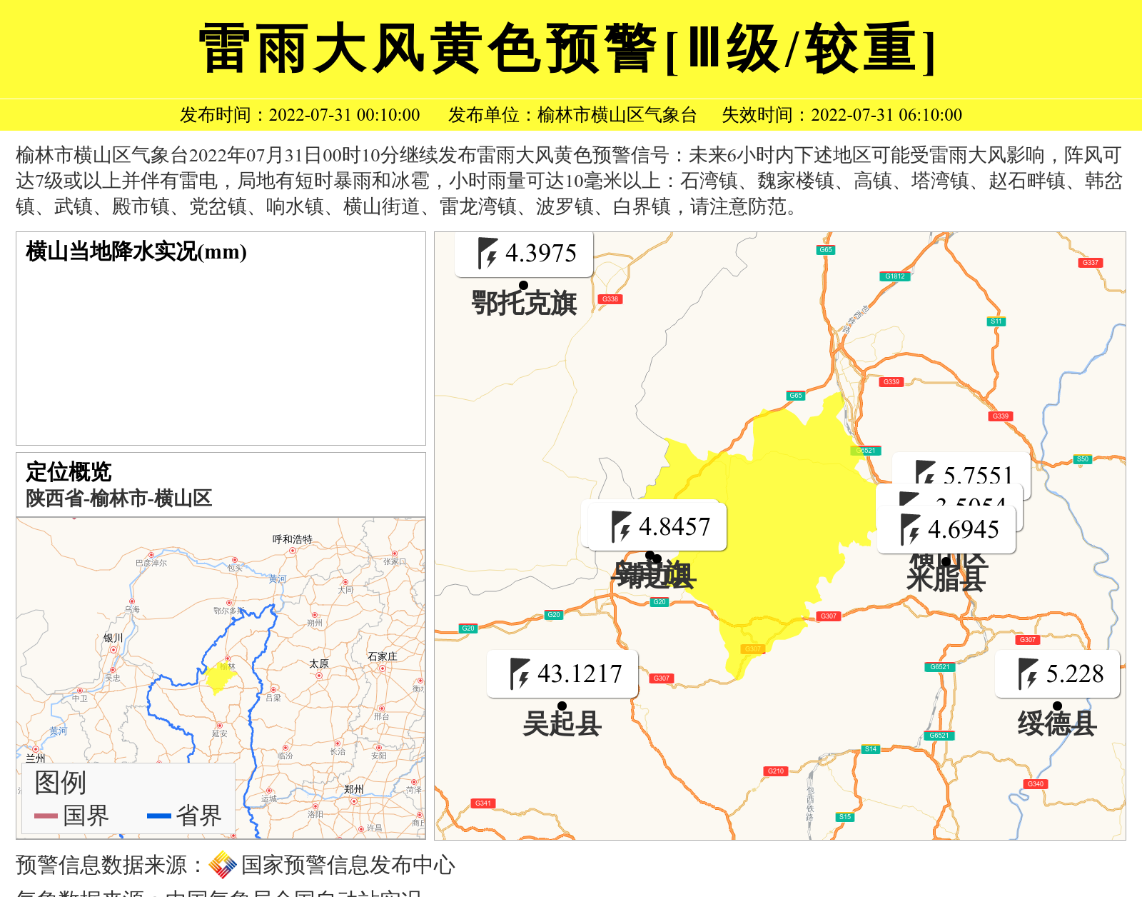 榆林市横山区气象台2022年07月31日00时10分继续发布雷雨大风黄色预警信号:未来6小时内下述地区可能受雷雨大风影响,阵风可达7级或以上并伴有雷电,局地有短时暴雨和冰雹,小时雨量可达10毫米以上:石湾镇、魏家楼镇、高镇、塔湾镇、赵石畔镇、韩岔镇、武镇、殿市镇、党岔镇、响水镇、横山街道、雷龙湾镇、波罗镇、白界镇,请注意防范。 信息来源:国家预警信息发布中心; 发布单位:榆林市横山区气象台。