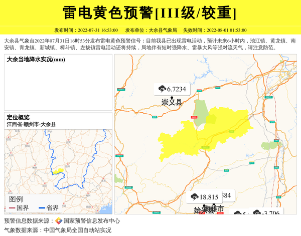 大余县气象台2022年07月31日16时53分发布雷电黄色预警信号:目前我县已出现雷电活动,预计未来6小时内,池江镇、黄龙镇、南安镇、青龙镇、新城镇、樟斗镇、左拔镇雷电活动还将持续,局地伴有短时强降水、雷暴大风等强对流天气,请注意防范。 信息来源:国家预警信息发布中心; 发布单位:大余县气象局。