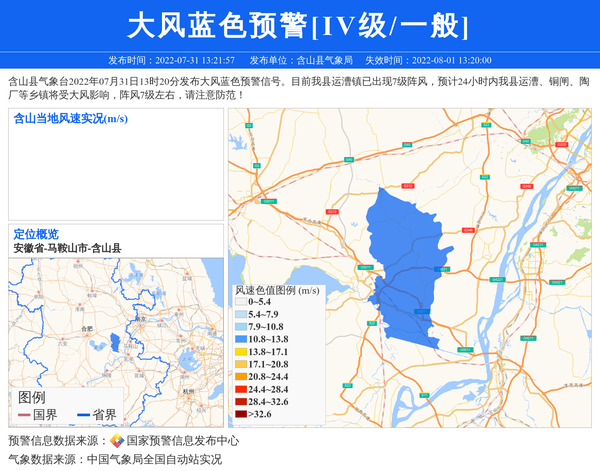 含山县气象台2022年07月31日13时20分发布大风蓝色预警信号。目前我县运漕镇已出现7级阵风,预计24小时内我县运漕、铜闸、陶厂等乡镇将受大风影响,阵风7级左右,请注意防范! 信息来源:国家预警信息发布中心; 发布单位:含山县气象局。