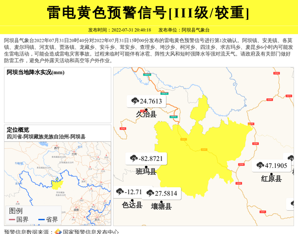 阿坝县气象台2022年07月31日20时40分对2022年07月31日15时00分发布的雷电黄色预警信号进行第1次确认。阿坝镇、安羌镇、各莫镇、麦尔玛镇、河支镇、贾洛镇、龙藏乡、安斗乡、茸安乡、查理乡、垮沙乡、柯河乡、四洼乡、求吉玛乡、麦昆乡6小时内可能发生雷电活动,可能会造成雷电灾害事故。过程来临时可能伴有冰雹、阵性大风和短时强降水等强对流天气。请政府及有关部门做好防雷工作,避免户外露天活动和高空等户外作业。 信息来源:国家预警信息发布中心; 发布单位:阿坝县气象台。