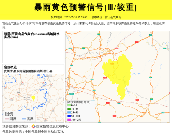 雷山县气象台7月31日17时29分发布暴雨黄色预警信号:预计未来6小时我县大塘、望丰等乡镇降雨量将达50毫米以上,请注意防范。 信息来源:国家预警信息发布中心; 发布单位:雷山县气象台。