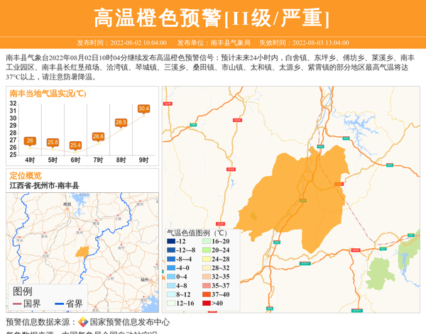 南丰县气象台2022年08月02日10时04分继续发布高温橙色预警信号:预计未来24小时内,白舍镇、东坪乡、傅坊乡、莱溪乡、南丰工业园区、南丰县长红垦殖场、洽湾镇、琴城镇、三溪乡、桑田镇、市山镇、太和镇、太源乡、紫霄镇的部分地区最高气温将达37°C以上,请注意防暑降温。 信息来源:国家预警信息发布中心; 发布单位:南丰县气象局。