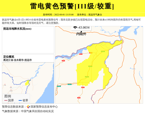 抚远市气象台8月1日13时55分发布雷电黄色预警信号:我市北部乡镇已出现雷电活动,预计未来6小时内我市仍有雷雨天气,局地可能伴有大风、短时强降水等强对流天气,请注意预防。 信息来源:国家预警信息发布中心; 发布单位:抚远市气象台。