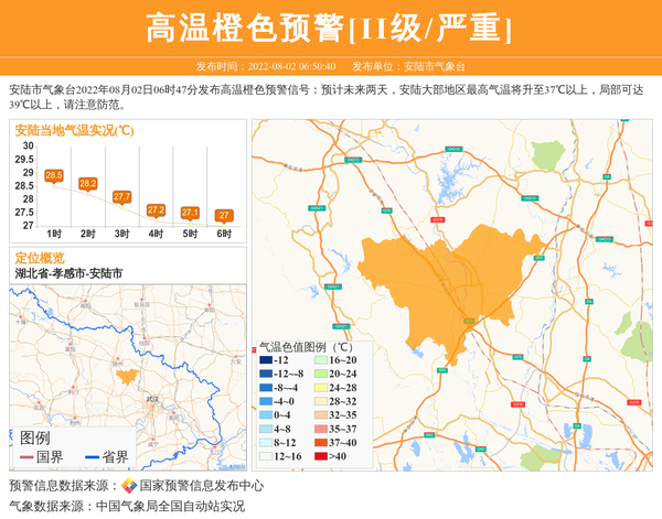 安陆市气象台2022年08月02日06时47分发布高温橙色预警信号:预计未来两天,安陆大部地区最高气温将升至37℃以上,局部可达39℃以上,请注意防范。 信息来源:国家预警信息发布中心; 发布单位:安陆市气象台。