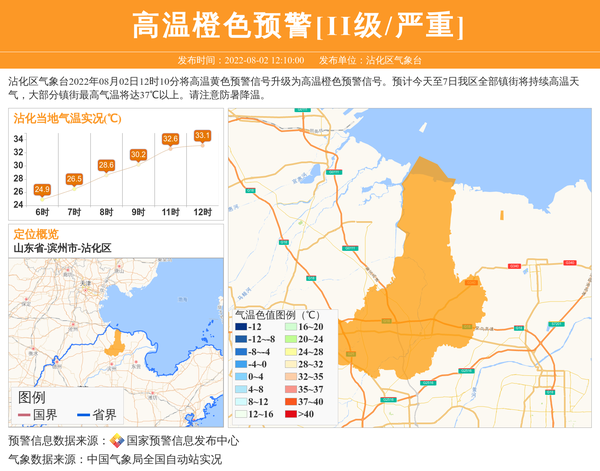 沾化区气象台2022年08月02日12时10分将高温黄色预警信号升级为高温橙色预警信号。预计今天至7日我区全部镇街将持续高温天气,大部分镇街最高气温将达37℃以上。请注意防暑降温。 信息来源:国家预警信息发布中心; 发布单位:沾化区气象台。