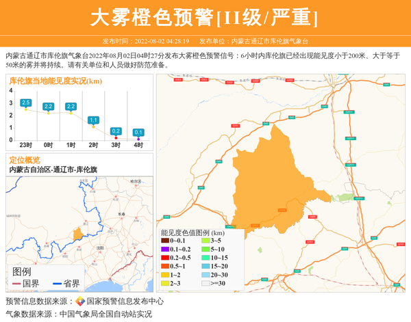 内蒙古通辽市库伦旗气象台2022年08月02日04时27分发布大雾橙色预警信号:6小时内库伦旗已经出现能见度小于200米、大于等于50米的雾并将持续。请有关单位和人员做好防范准备。 信息来源:国家预警信息发布中心; 发布单位:内蒙古通辽市库伦旗气象台。
