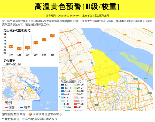 宝山区气象局2022年08月02日10时06分发布高温黄色预警[Ⅲ级/较重]:受西太平洋副热带高压影响,预计本区大部街镇园区今天的最高气温将超过35℃,请做好防暑降温工作。 信息来源:国家预警信息发布中心; 发布单位:宝山区气象局。