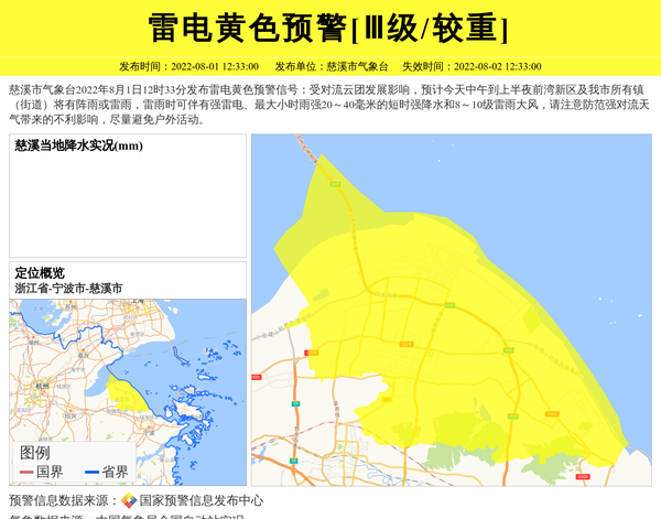 慈溪市气象台2022年8月1日12时33分发布雷电黄色预警信号:受对流云团发展影响,预计今天中午到上半夜前湾新区及我市所有镇(街道)将有阵雨或雷雨,雷雨时可伴有强雷电、最大小时雨强20~40毫米的短时强降水和8~10级雷雨大风,请注意防范强对流天气带来的不利影响,尽量避免户外活动。 信息来源:国家预警信息发布中心; 发布单位:慈溪市气象台。