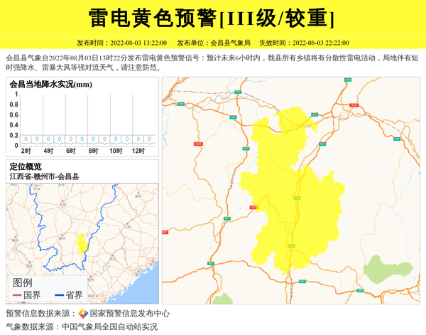 会昌县气象台2022年08月03日13时22分发布雷电黄色预警信号:预计未来6小时内,我县所有乡镇将有分散性雷电活动,局地伴有短时强降水、雷暴大风等强对流天气,请注意防范。 信息来源:国家预警信息发布中心; 发布单位:会昌县气象局。
