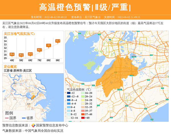 吴江区气象台2022年08月02日09时48分升级发布高温橙色预警信号:预计今天我区大部分地区的街道(镇)最高气温将达37℃左右,请注意防暑降温。 信息来源:国家预警信息发布中心; 发布单位:吴江区气象台。