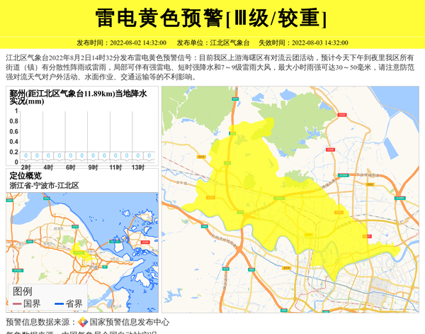 江北区气象台2022年8月2日14时32分发布雷电黄色预警信号:目前我区上游海曙区有对流云团活动,预计今天下午到夜里我区所有街道(镇)有分散性阵雨或雷雨,局部可伴有强雷电、短时强降水和7~9级雷雨大风,最大小时雨强可达30~50毫米,请注意防范强对流天气对户外活动、水面作业、交通运输等的不利影响。 信息来源:国家预警信息发布中心; 发布单位:江北区气象台。