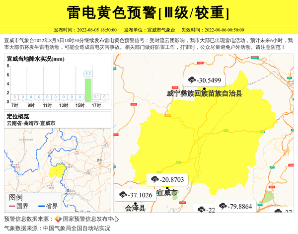 宣威市气象台2022年8月5日18时50分继续发布雷电黄色预警信号:受对流云团影响,我市大部已出现雷电活动,预计未来6小时,我市大部仍将发生雷电活动,可能会造成雷电灾害事故。相关部门做好防雷工作,打雷时,公众尽量避免户外活动。请注意防范! 信息来源:国家预警信息发布中心; 发布单位:宣威市气象台。