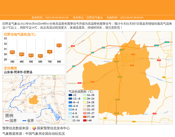 巨野县气象台2022年08月04日09时01分将高温黄色预警信号升级为高温橙色预警信号:预计今天白天到7日我县所辖镇街最高气温将达37℃以上,局部可达39℃,此次高温过程湿度大,体感温度高,持续时间长,请注意防范! 信息来源:国家预警信息发布中心; 发布单位:巨野县气象台。