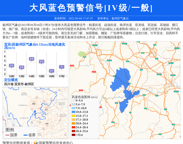 叙州区气象台2022年08月04日17时47分发布大风蓝色预警信号:柏溪街道、赵场街道、南岸街道、双龙镇、安边镇、高场镇、横江镇、南广镇、凤仪乡等乡镇(街道)24小时内可能受大风影响,平均风力可达6级以上或者阵风7级以上;或者已经受大风影响,平均风力为6—7级,或者阵风7—8级并可能持续。请注意关好门窗,加固围板、棚架、广告牌等搭建物;注意行路、行车安全、刮风时不要在广告牌、临时搭建物等下面逗留,暂停露天集体活动和水上作业,航行船舶回港避风。 信息来源:国家预警信息发布中心; 发布单位:叙州区气象台。