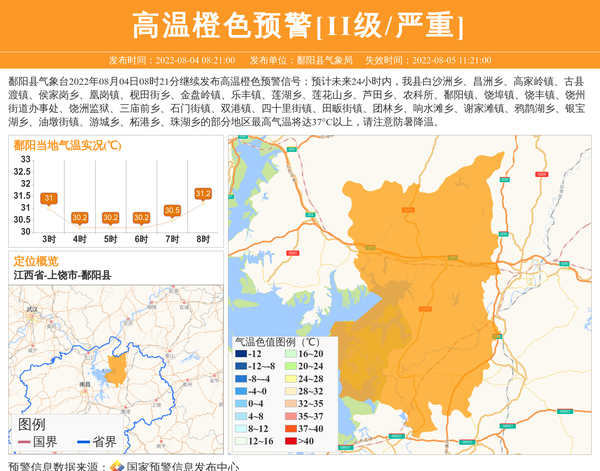 鄱阳县气象台2022年08月04日08时21分继续发布高温橙色预警信号:预计未来24小时内,我县白沙洲乡、昌洲乡、高家岭镇、古县渡镇、侯家岗乡、凰岗镇、枧田街乡、金盘岭镇、乐丰镇、莲湖乡、莲花山乡、芦田乡、农科所、鄱阳镇、饶埠镇、饶丰镇、饶州街道办事处、饶洲监狱、三庙前乡、石门街镇、双港镇、四十里街镇、田畈街镇、团林乡、响水滩乡、谢家滩镇、鸦鹊湖乡、银宝湖乡、油墩街镇、游城乡、柘港乡、珠湖乡的部分地区最高气温将达37°C以上,请注意防暑降温。 信息来源:国家预警信息发布中心; 发布单位:鄱阳县气象局。