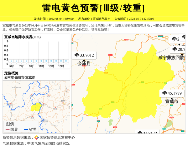 宣威市气象台2022年08月04日16时59分发布雷电黄色预警信号:预计未来6小时,我市大部将发生雷电活动,可能会造成雷电灾害事故。相关部门做好防雷工作,打雷时,公众尽量避免户外活动。请注意防范! 信息来源:国家预警信息发布中心; 发布单位:宣威市气象台。