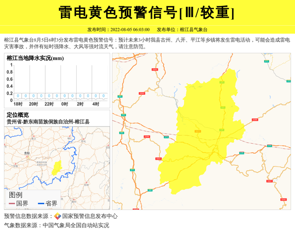 榕江县气象台8月5日6时3分发布雷电黄色预警信号:预计未来3小时我县古州、八开、平江等乡镇将发生雷电活动,可能会造成雷电灾害事故,并伴有短时强降水、大风等强对流天气,请注意防范。 信息来源:国家预警信息发布中心; 发布单位:榕江县气象台。