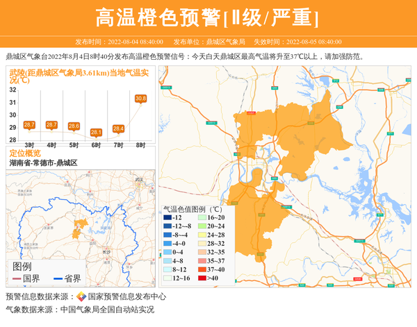 鼎城区气象台2022年8月4日8时40分发布高温橙色预警信号:今天白天鼎城区最高气温将升至37℃以上,请加强防范。 信息来源:国家预警信息发布中心; 发布单位:鼎城区气象局。