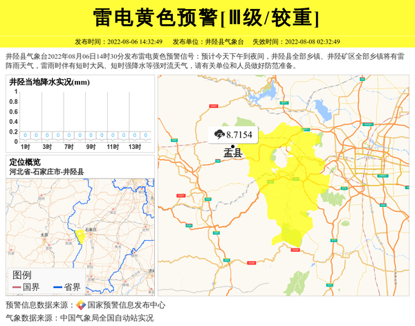 井陉县气象台2022年08月06日14时30分发布雷电黄色预警信号:预计今天下午到夜间,井陉县全部乡镇、井陉矿区全部乡镇将有雷阵雨天气,雷雨时伴有短时大风、短时强降水等强对流天气,请有关单位和人员做好防范准备。 信息来源:国家预警信息发布中心; 发布单位:井陉县气象台。