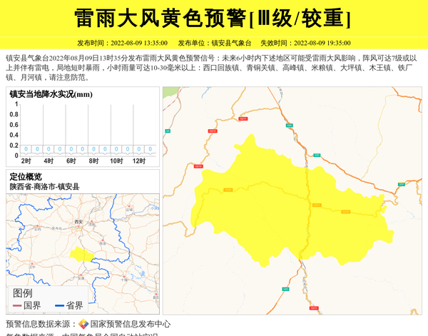 镇安县气象台2022年08月09日13时35分发布雷雨大风黄色预警信号:未来6小时内下述地区可能受雷雨大风影响,阵风可达7级或以上并伴有雷电,局地短时暴雨,小时雨量可达10-30毫米以上:西口回族镇、青铜关镇、高峰镇、米粮镇、大坪镇、木王镇、铁厂镇、月河镇,请注意防范。 信息来源:国家预警信息发布中心; 发布单位:镇安县气象台。