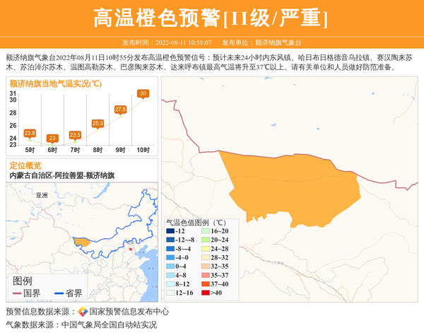 额济纳旗气象台2022年08月11日10时55分发布高温橙色预警信号:预计未来24小时内东风镇、哈日布日格德音乌拉镇、赛汉陶来苏木、苏泊淖尔苏木、温图高勒苏木、巴彦陶来苏木、达来呼布镇最高气温将升至37℃以上。请有关单位和人员做好防范准备。 信息来源:国家预警信息发布中心; 发布单位:额济纳旗气象台。