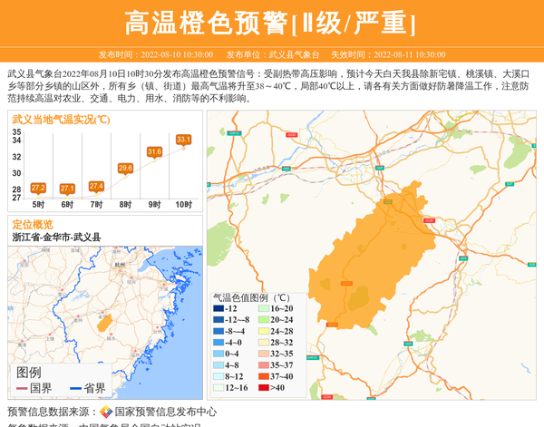 武义县气象台2022年08月10日10时30分发布高温橙色预警信号:受副热带高压影响,预计今天白天我县除新宅镇、桃溪镇、大溪口乡等部分乡镇的山区外,所有乡(镇、街道)最高气温将升至38~40℃,局部40℃以上,请各有关方面做好防暑降温工作,注意防范持续高温对农业、交通、电力、用水、消防等的不利影响。 信息来源:国家预警信息发布中心; 发布单位:武义县气象台。