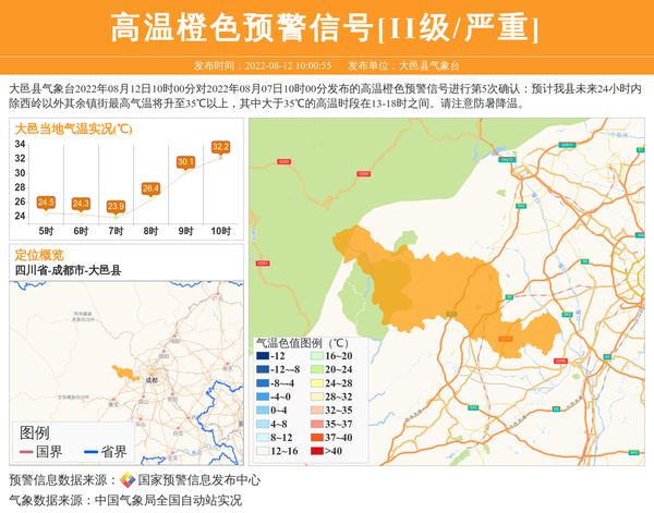 大邑县气象台2022年08月12日10时00分对2022年08月07日10时00分发布的高温橙色预警信号进行第5次确认:预计我县未来24小时内除西岭以外其余镇街最高气温将升至35℃以上,其中大于35℃的高温时段在13-18时之间。请注意防暑降温。 信息来源:国家预警信息发布中心; 发布单位:大邑县气象台。